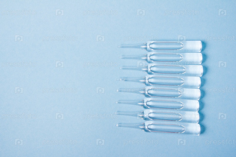 Несколько больших стеклянных ампул с лекарствами на синем фоне копией пространства, вид сверху