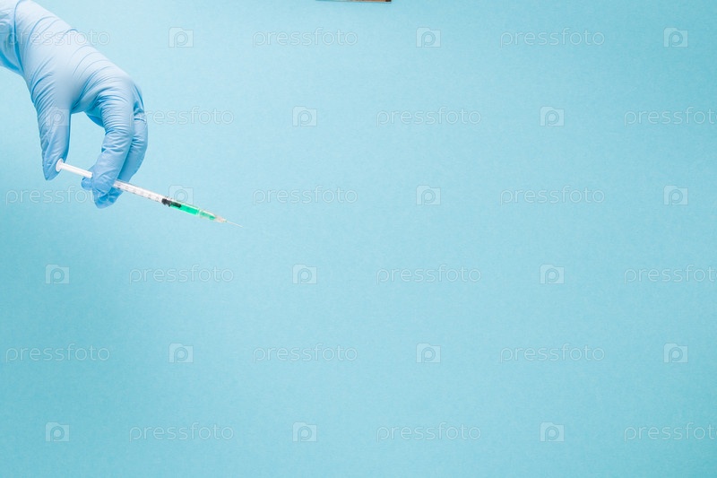 Женская рука в синей резиновой медицинской перчатке, держащая инсулиновый шприц с зеленым лекарством внутри на синем фоне копировального пространства, концепция лечения и здравоохранения, концепция диабета