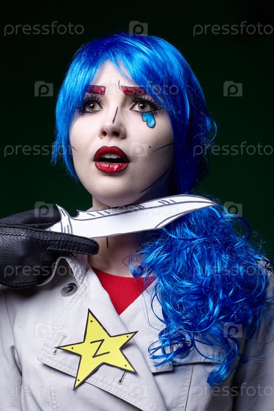 Женщина с ножом возле горла. Портрет молодой женщины в стиле комического поп-арта