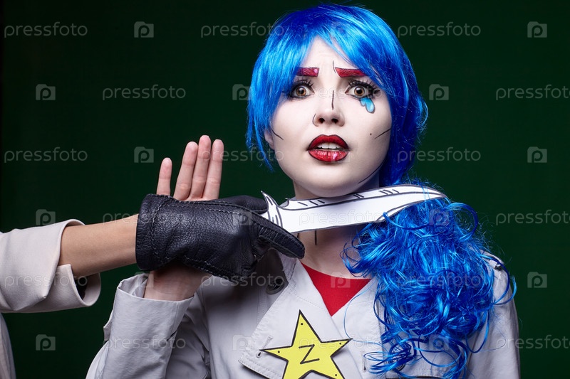 Женщина с ножом возле горла. Портрет молодой женщины в стиле комического поп-арта