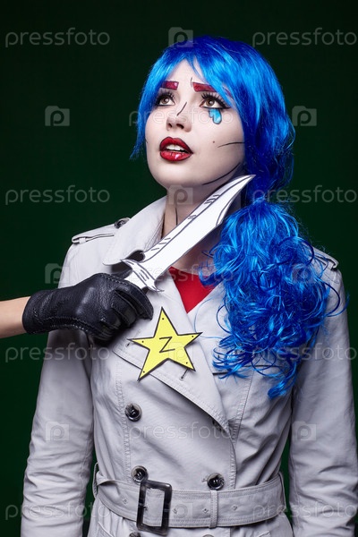 Женщина с ножом возле горла. Портрет молодой женщины в стиле комического поп-арта