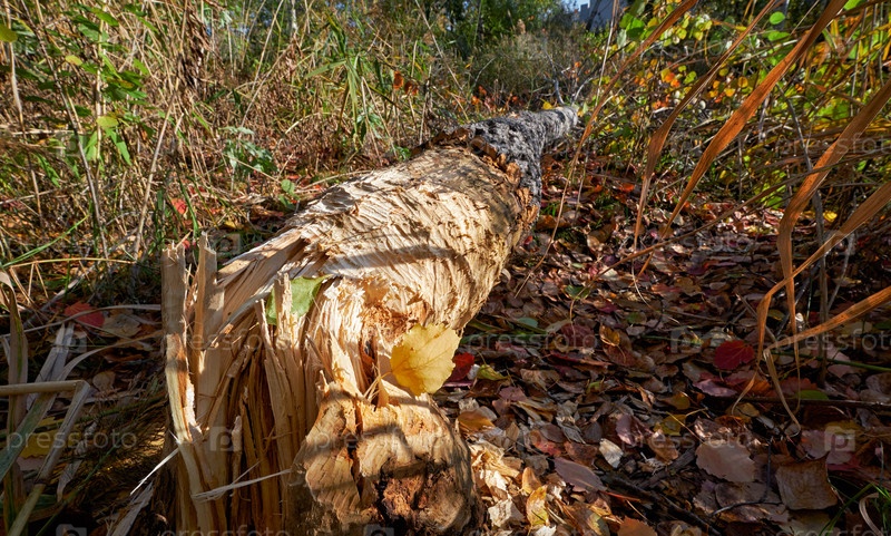 Бобры подгрызли ствол дерева и повалили осину