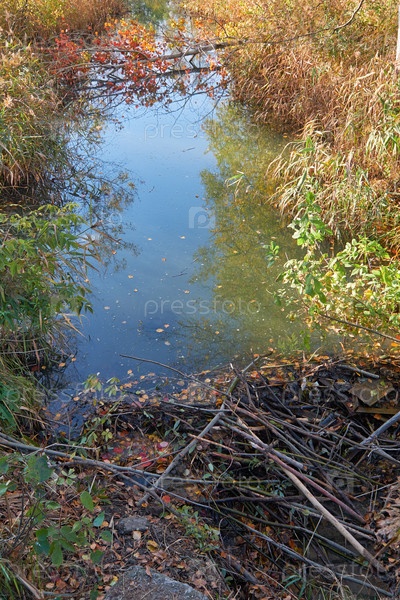 Видео плотины на небольшом ручье, построенной бобрами из веток