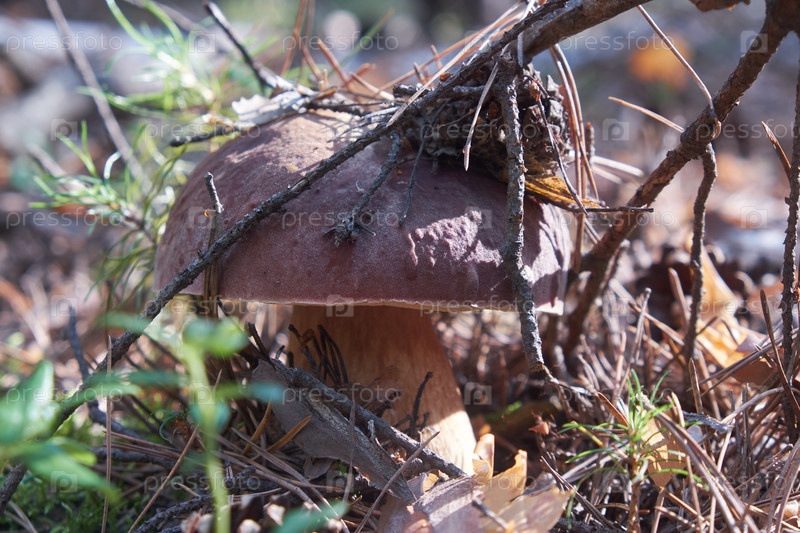 Гриб Boletus edulis или белый гриб в лесу