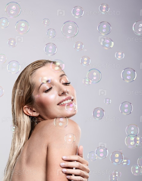 Красивая молодая блондинка с мыльными пузырями на сером фоне