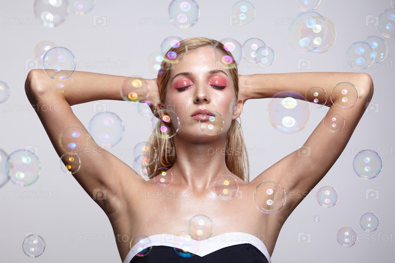 Красивая молодая блондинка с мыльными пузырями на сером фоне