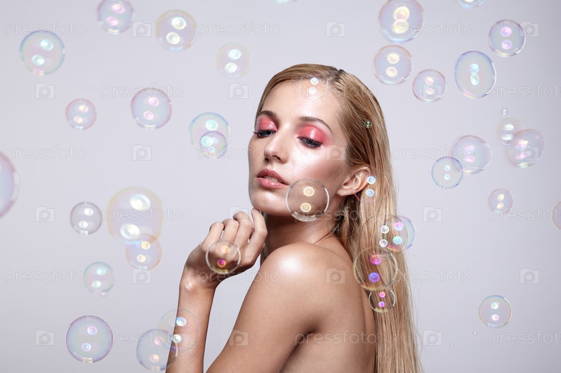 Красивая молодая блондинка с мыльными пузырями на сером фоне