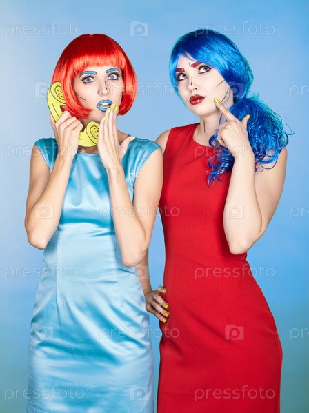 Портрет молодых женщин в стиле комического поп-арта. Женщины в красных и синих париках звонят по телефону