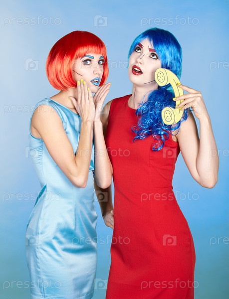 Портрет молодых женщин в стиле комического поп-арта. Женщины в красных и синих париках звонят по телефону