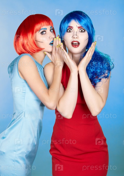 Портрет молодых женщин в стиле комического поп-арта. Шокированные женщины в красных и синих париках