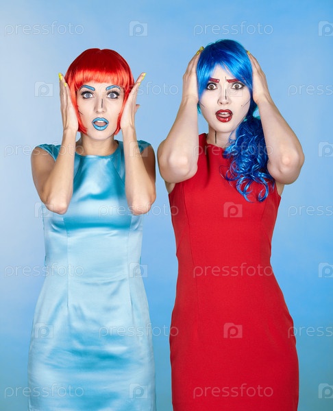 Портрет молодых женщин в стиле комического поп-арта. Шокированные женщины в красных и синих париках