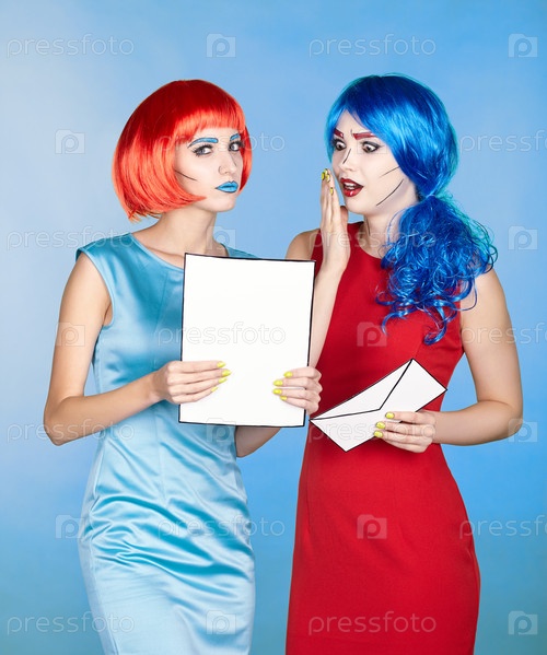 Портрет молодых женщин в стиле комического поп-арта. Женщины читают письмо