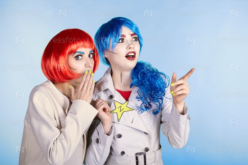 Женщины-детективы расследуют преступление. Молодые женщины в стиле комического поп-арта