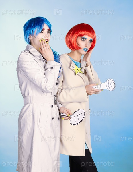 Женщины-детективы расследуют преступление. Молодые женщины в стиле комического поп-арта