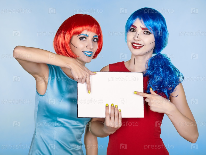 Женщины с бумагой в руках. Портрет молодых женщин в стиле комического поп-арта