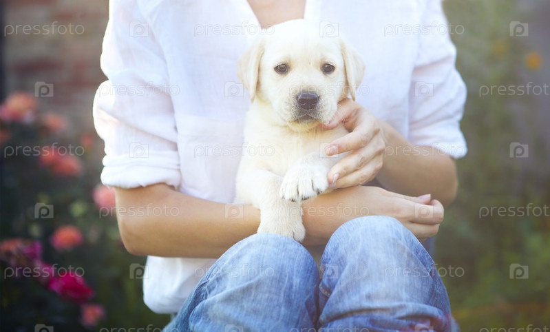 Женщина в белой блузке с щенком лабрадора сидит на коленях