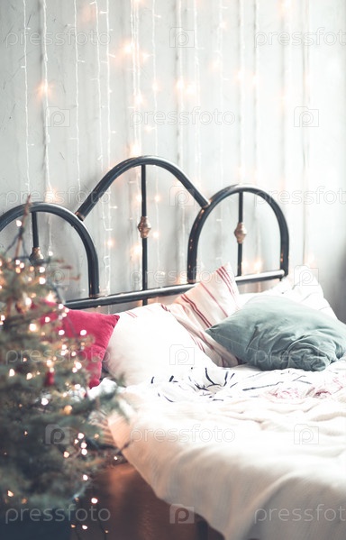 Винтажная кровать в комнате с рождественским украшением