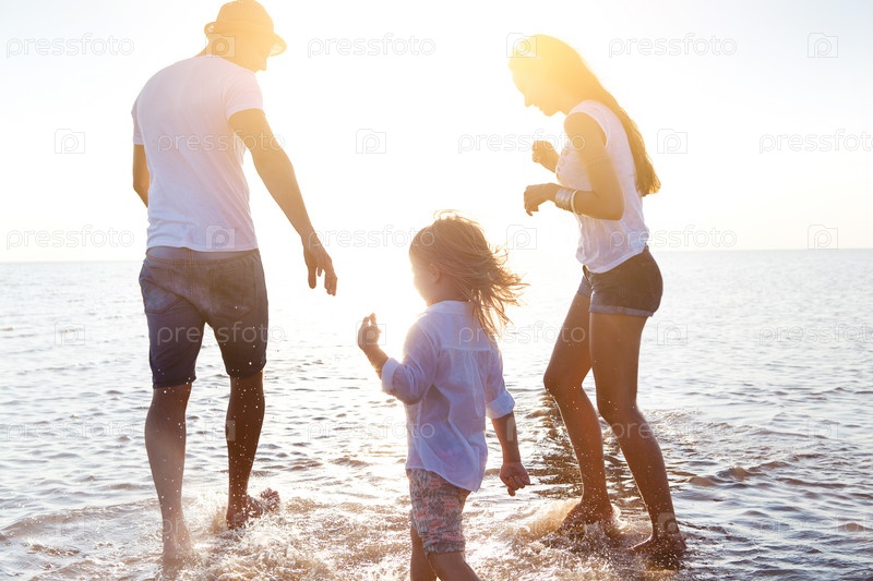 Счастливая семья гуляет по морской воде