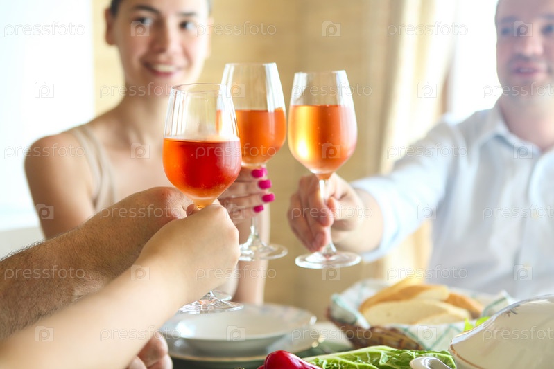 Крупный план четырех бокалов с розовым вином, чокающихся вместе