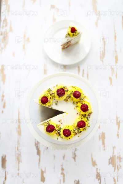Красивый торт с днем рождения с маскарпоне, украшенный малиной, фисташками и свечами на подставке для торта