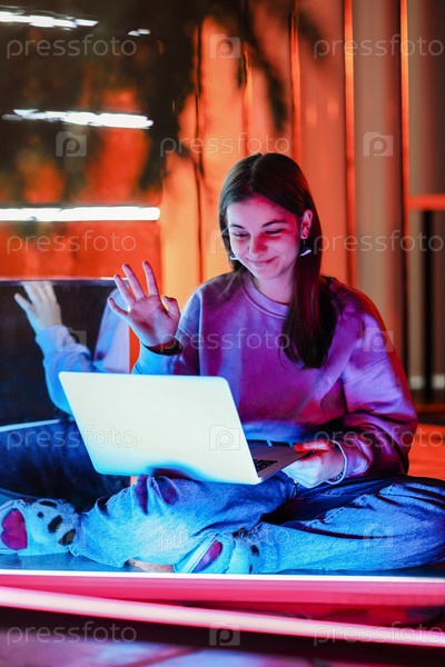 Девушка-подросток смотрит видео на ноутбуке
