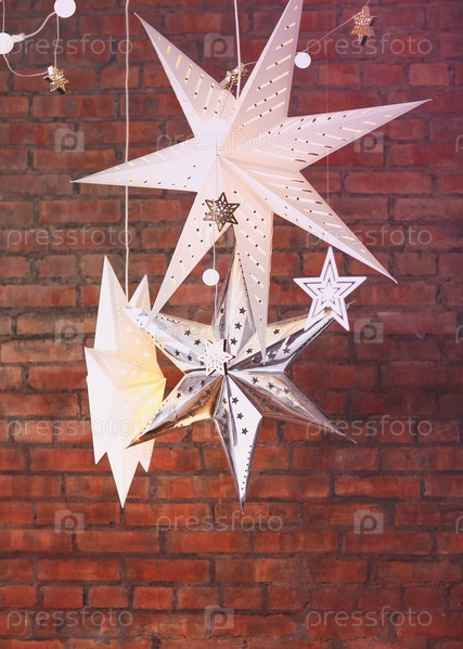 Декоративные звезды, висящие на кирпичной стене