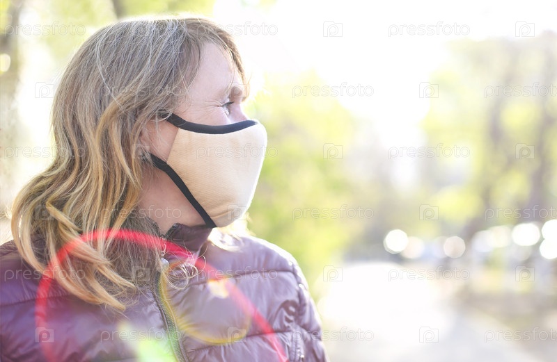 Счастливая пожилая женщина в медицинской маске на открытом воздухе
