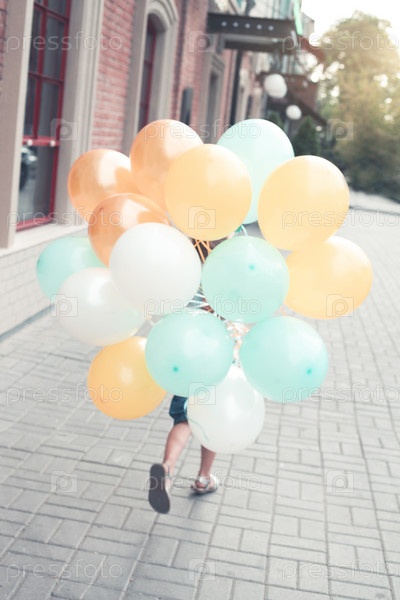 Ребенок с кучей разноцветных воздушных шаров бежит