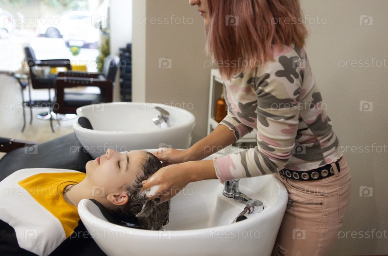 молодая девушка-подросток наслаждается массажем головы во время мытья волос профессиональным парикмахером