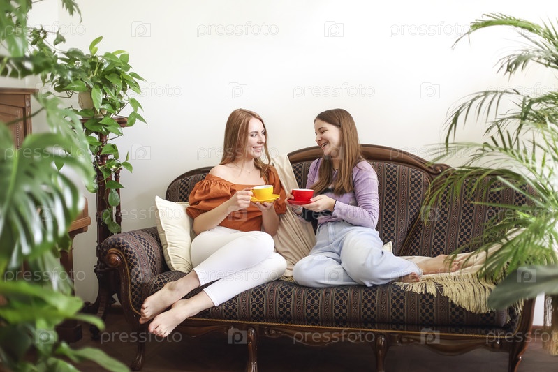 Женщины пьют чай на диване и болтают