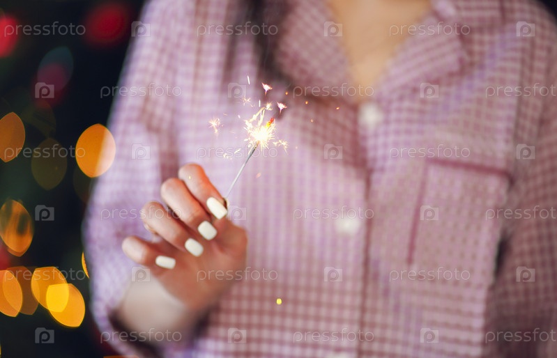 Счастливая женщина с бенгальским огнем и шампанским против рождественской елки