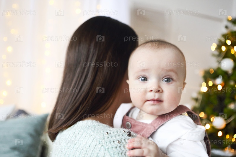 Красивая счастливая мать с младшей дочерью в вязаном свитере сидит на фоне рождественского интерьера