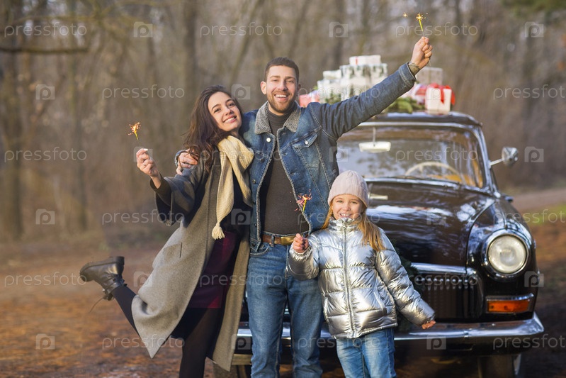 Счастливая семья с бенгальскими огнями на ретро-машине с подарками