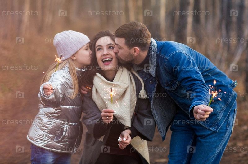 Счастливая семья с бенгальскими огнями в лесу