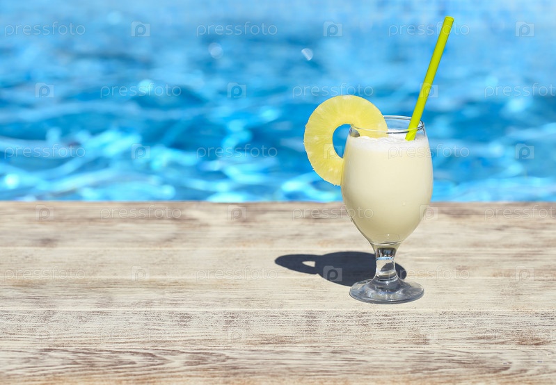 Стакан коктейля пинаколада стоит на выступе бассейна