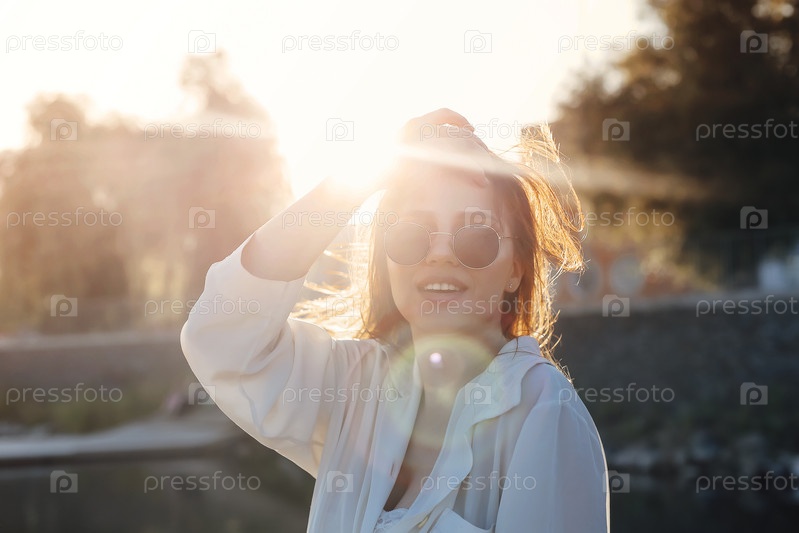 Очаровательная женщина в городе на закате