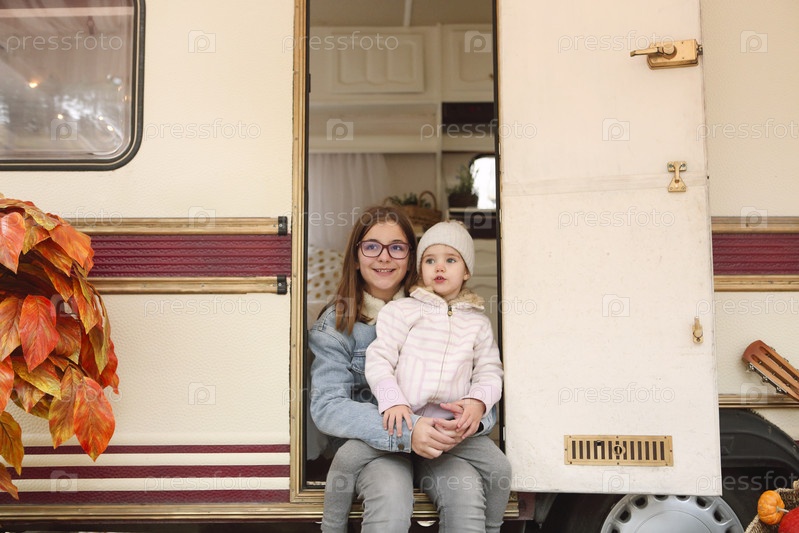 Маленькие девочки улыбаются, сидя в трейлере