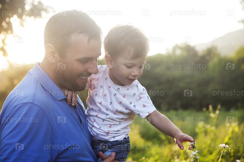 Портрет молодого человека, держащего в руках очаровательного спящего ребенка в саду
