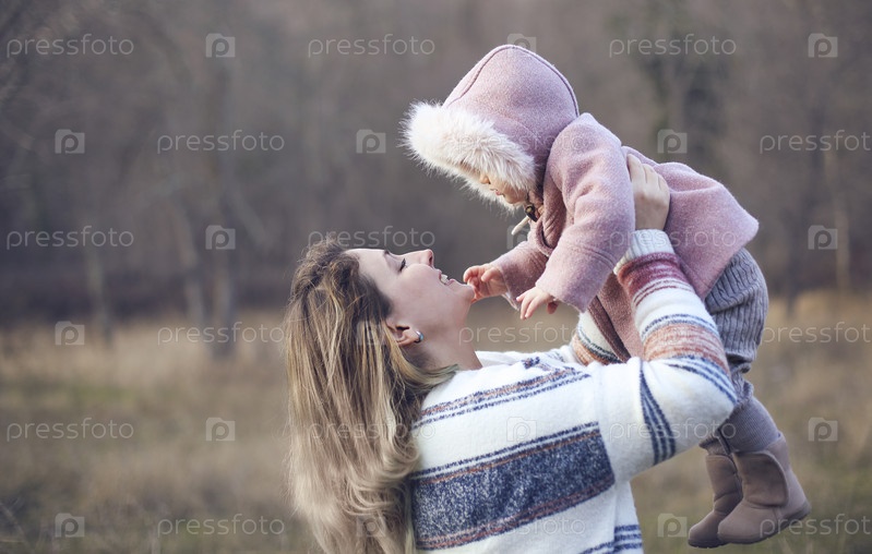 Молодая мать и дочь на улице вместе. Осенний портрет