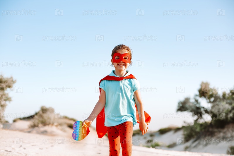 Ребенок-супергерой играет с гибкой игрушкой Pop It fidget на открытом воздухе