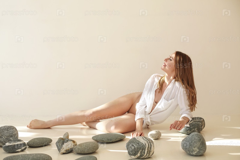 Спокойная женщина среди камней в светлой студии