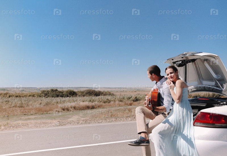 Романтическая пара с гитарой отдыхает возле машины