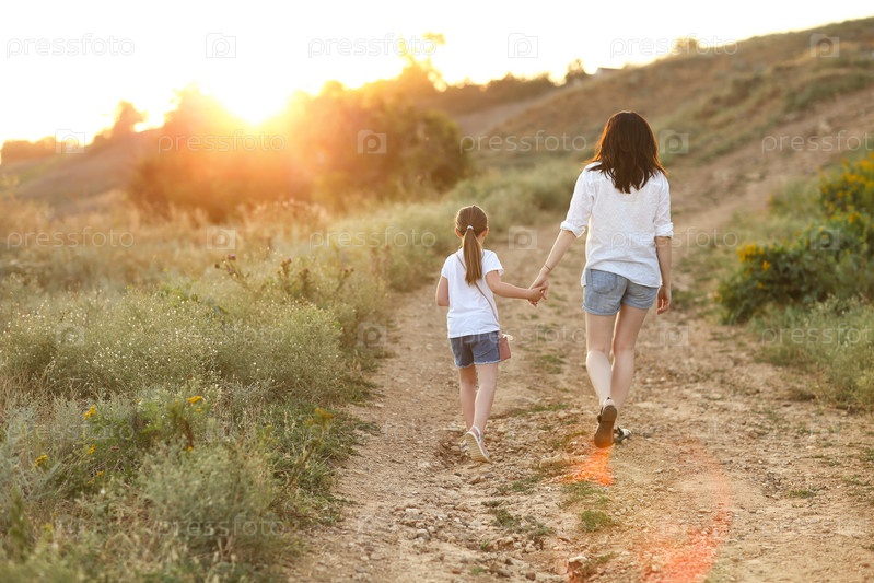 Любящая мать гуляет с дочерью в сельской местности