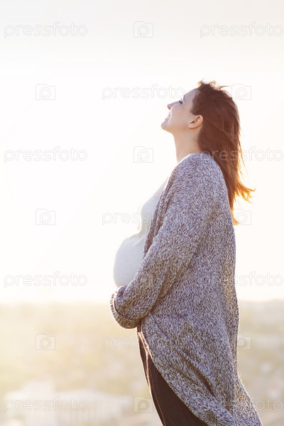 Счастливая беременная женщина на открытом воздухе осенним днем на фоне города