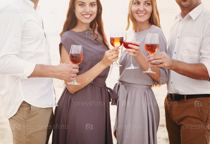 Счастливые друзья вместе отдыхают на берегу и устраивают пикник