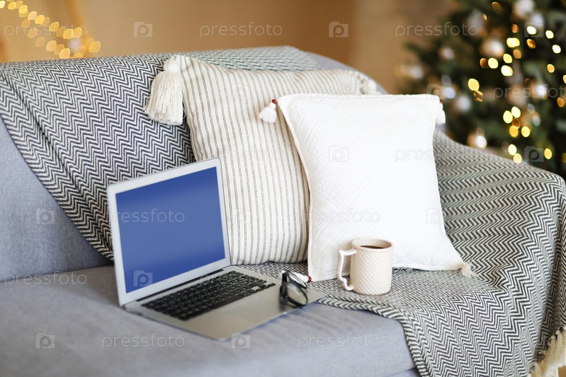 Ноутбук на диване в комнате с праздничными огнями елки