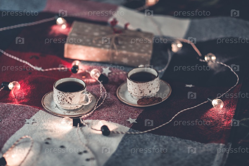 Уютная кровать с чашками кофе и подарочной коробкой