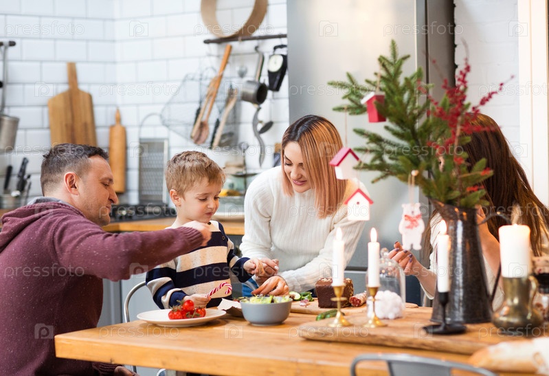 Родители с детьми на кухне во время рождественских каникул