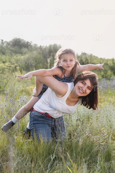 Мать и дочь веселятся в поле