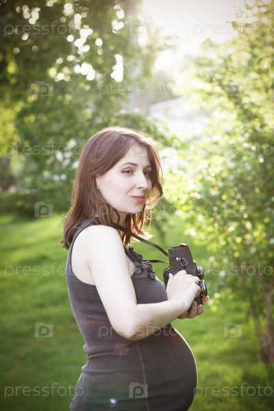 Беременная женщина с фотоаппаратом стоит в парке
